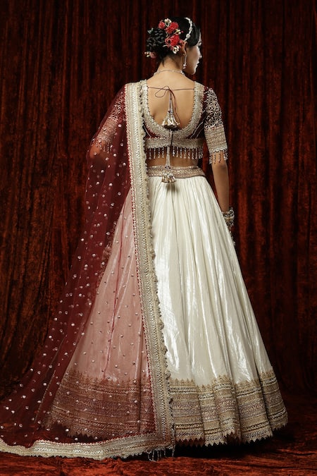 Silver lehenga featuring embroidered borders and attached cancan. Paired with a maroon padded blouse and net dupatta with scalloped borders.