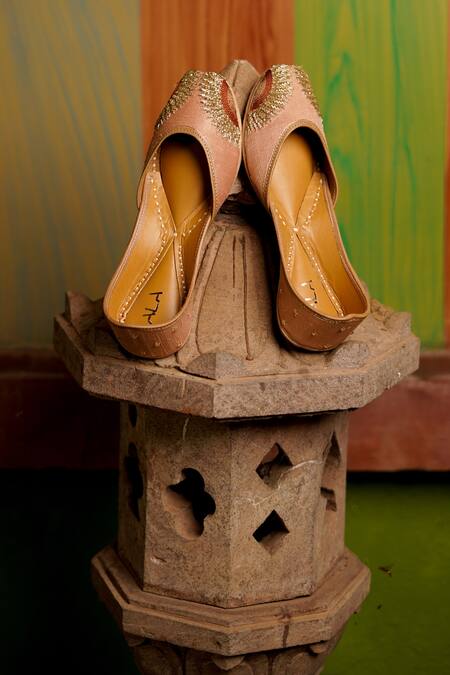 Light brown juttis featuring floral gold zardozi thread and zari embroidery