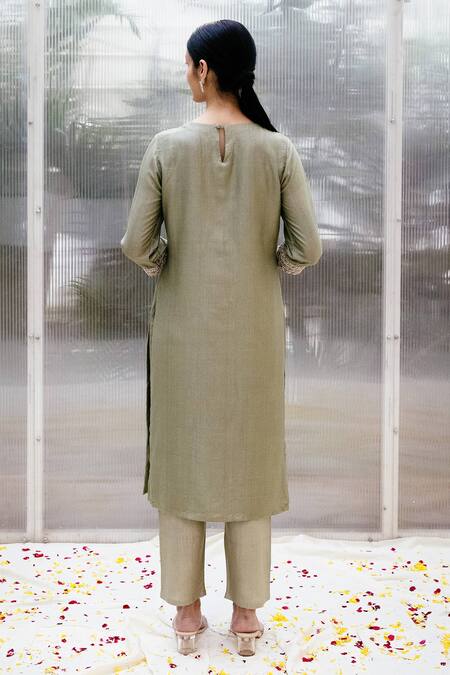 Olive green kurta in ahimsa silk base fabric with resham and zardozi embroidery on neckline. Paired with straight pant & tara butti spread dupatta.