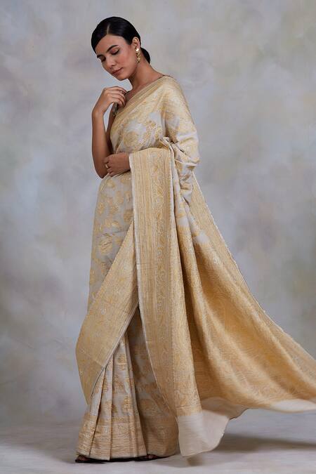 Buy_Priyanka Raajiv_White Muga Banarasi Kadua Floral Motifs Chandramallika Woven Saree_Online_at_Aza_Fashions