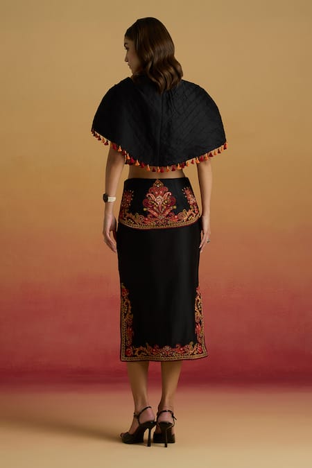A black chanderi crop top featuring applique and thread work embroidery, pleated details, and an attached lining.
