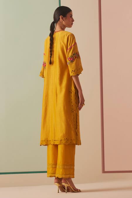 Mustard chanderi kurta featuring flared sleeves, round neckline, and intricate cutwork and bead embroidery. Paired with matching pant and attached lining for comfort.