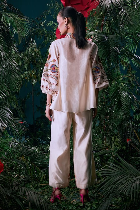 Ivory chanderi shirt featuring multi-colored floral, thread and beaded embroidery