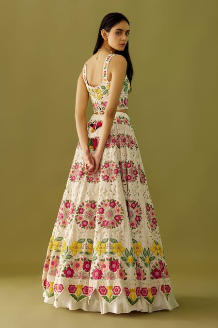 Ivory chanderi lehenga with multi colored embroidery & floral applique work.