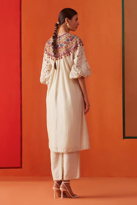 Ivory straight kurta in chanderi fabric featuring a round neckline and balloon sleeves. Paired with matching floral embroidered pants, both adorned with intricate floral cut-work patterns.