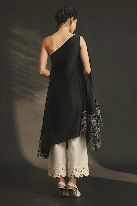 Black one-shoulder kurta with asymmetric hem, floral motifs, extended sleeve drape & cutwork detail.