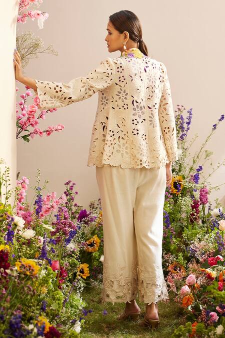 Ivory cutwork jacket featuring multicolor bead and thread embroidery on the collar