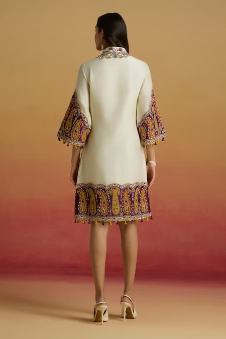Ivory Chanderi Embroidery, Beads, Tassels Collared Colorblock Paisley Dress