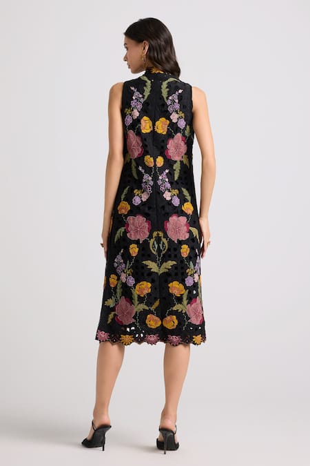 Black chanderi long jacket featuring floral chainstitch, cutwork, thread, and beaded embroidery