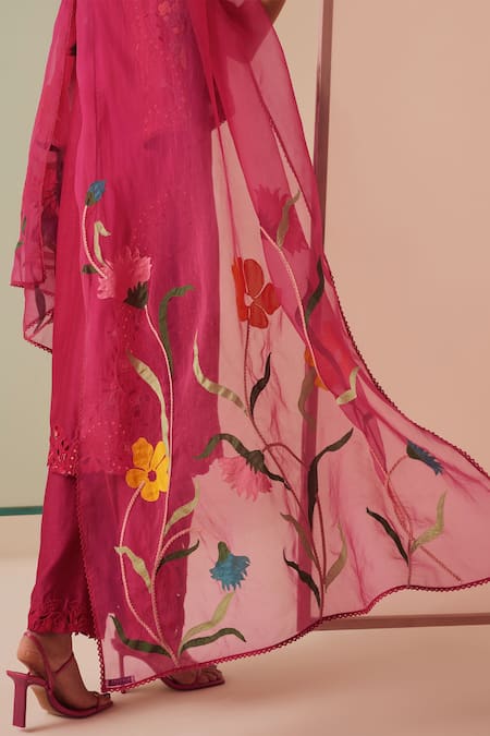 Pink Silk Organza Embroidery Flora Applique Dupatta