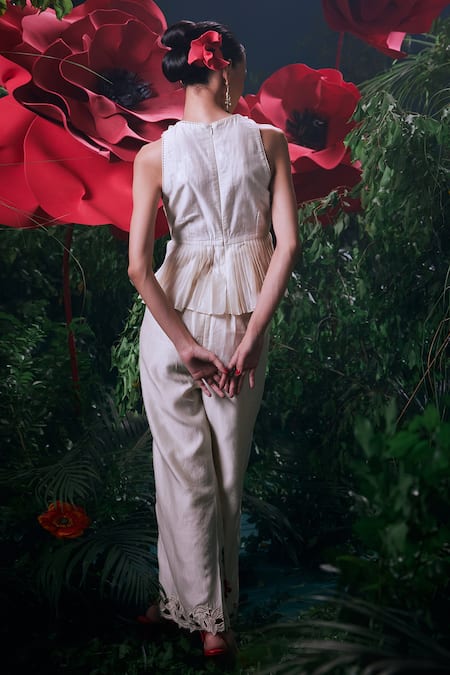 Ivory chanderi top featuring pleated design and 3D floral applique embroidery