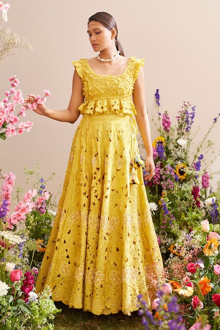 Yellow Chanderi Embroidery Scoop Neck Floral Applique Sleeveless Bustier