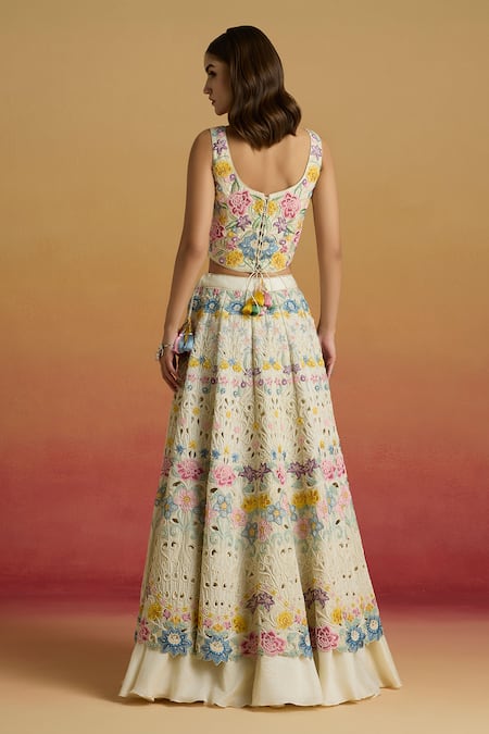 An ivory Chanderi lehenga featuring pastel floral thread work, cord work, and beadwork with an attached lining.