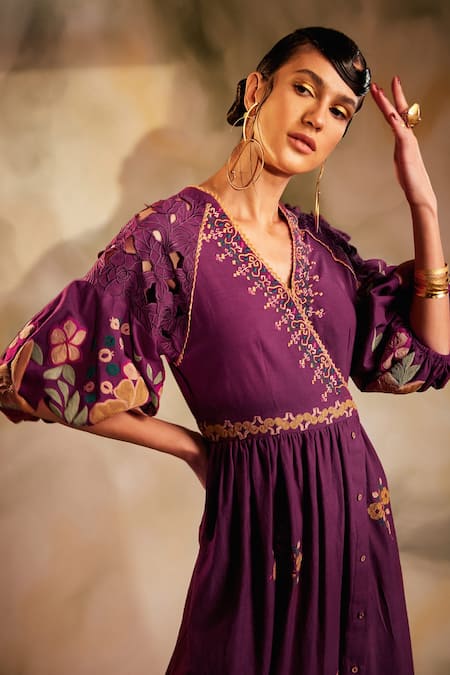 Plum dress highlighted with floral embroidery, overlaped neckline, cutwork balloon sleeves, gathers at the waist & button placket.