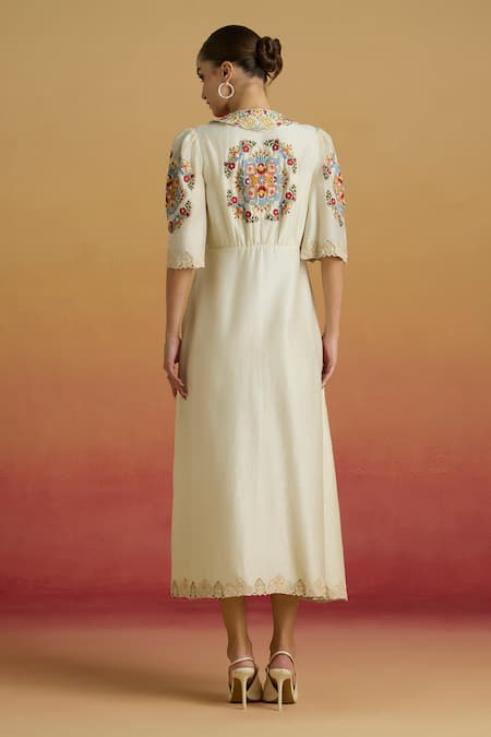 An ivory chanderi midi dress featuring floral thread work and beadwork, with an attached lining.