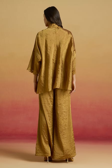 A gold tissue flared pant featuring contrast applique details and an attached lining.