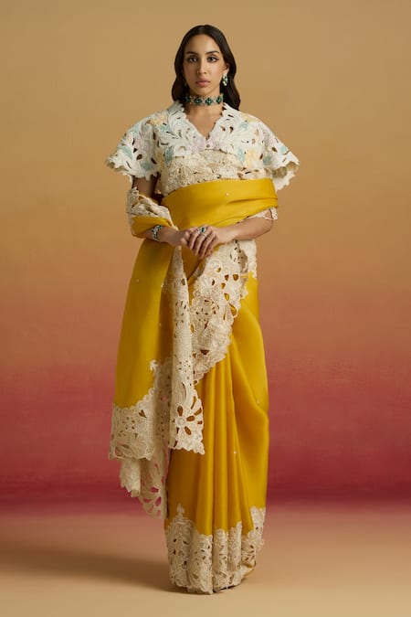 An ivory chanderi cape featuring cord work and beadwork embellishments.