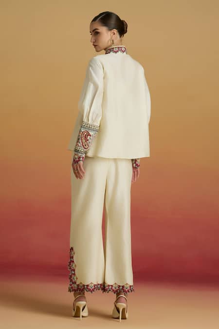 Ivory chanderi pant featuring paisley applique, thread work, and beadwork with a slit detail.