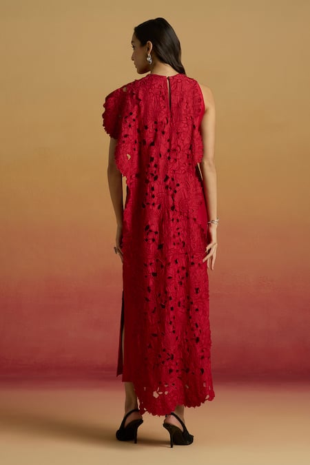 Red Chanderi Embroidery, Beads, Cut Work Round Draped Detail Straight Dress