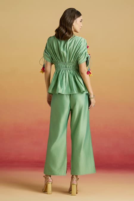 A sage green chanderi straight pant featuring 3D floral applique detailing on the hem.