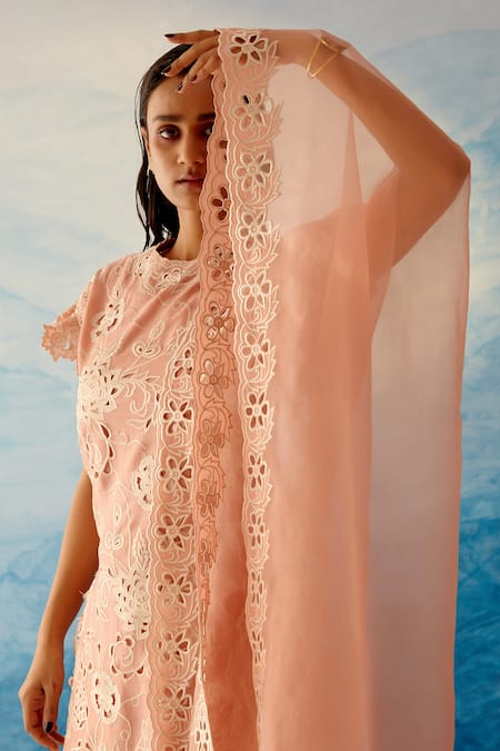 Peach silk organza dupatta with floral motifs in cutwork embroidery.