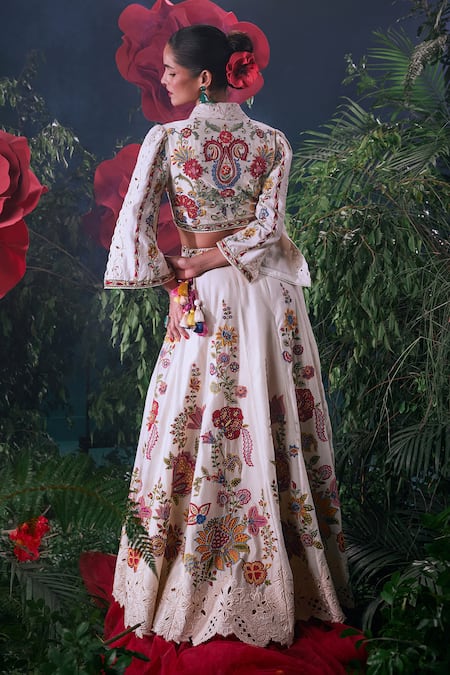 Ivory flared kalidar lehenga featuring wildflora bloom multi-thread embroidery, applique, cut work, and tonal beads highlights