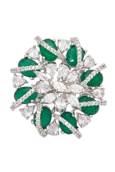 White adjustable ring featuring flower cutwork design adorned with diamond embellishments and emerald stone highlights