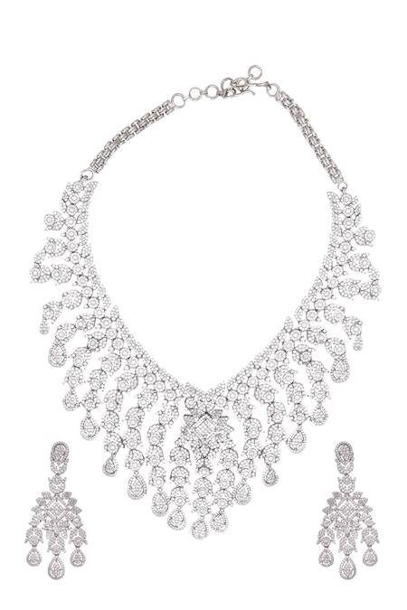Silver plated floral jaal pattern necklace embellished with white stones. Paired with matching earrings featuring similar stone embellishments.