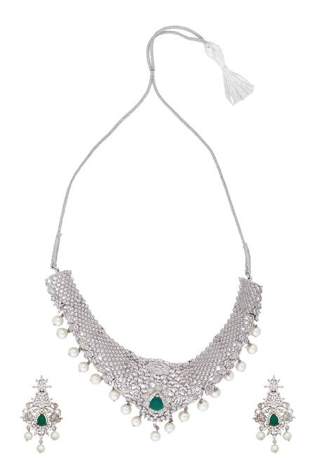 Silver plated floral jaali patterned choker necklace embellished with white stones, green emerald detail, and pearl drops. Paired with matching earrings featuring similar embellishments.