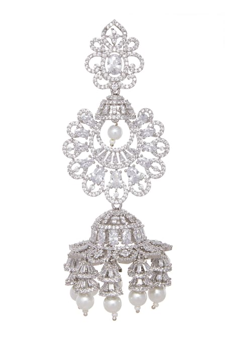 Silver plated floral chandbali jhumka earrings featuring white multi-shape stones and pearl drops