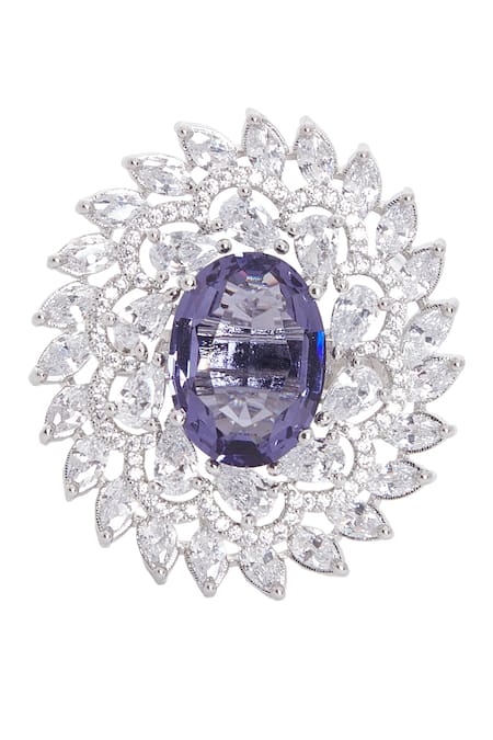 Central blue stone surrounded by diamond embellishments, Intricate flower cutwork design, Adjustable band for comfort