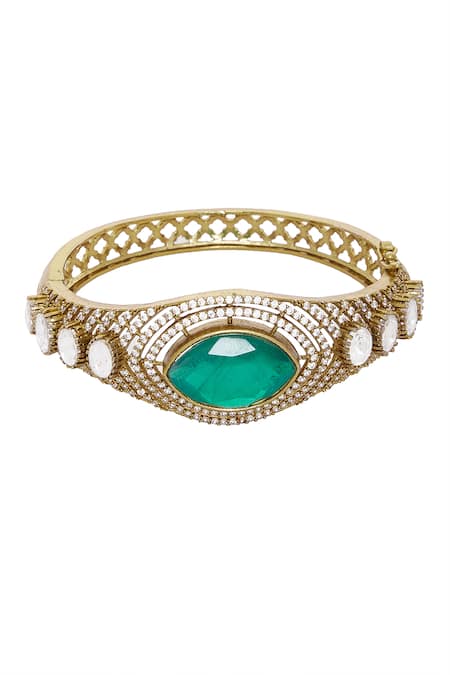 Intricate filigree design on the bangle, Central green polki stone with white stone embellishments
