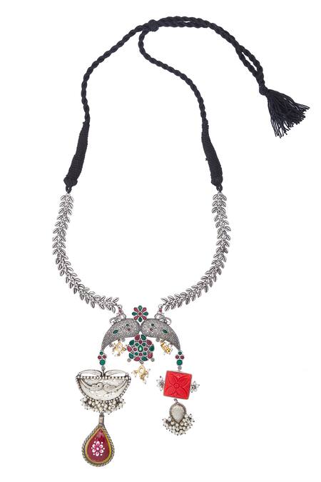 Silver plated oxidised metallic pendant necklace featuring embellishments of pearls, beads, and stones