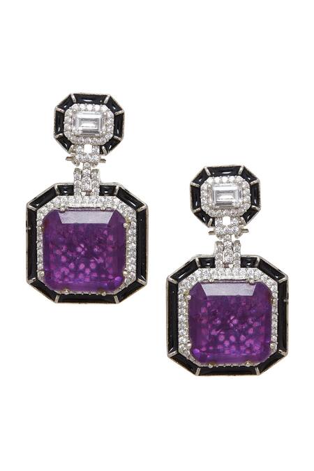 Silver plated geometric earrings featuring a purple central stone drop motif