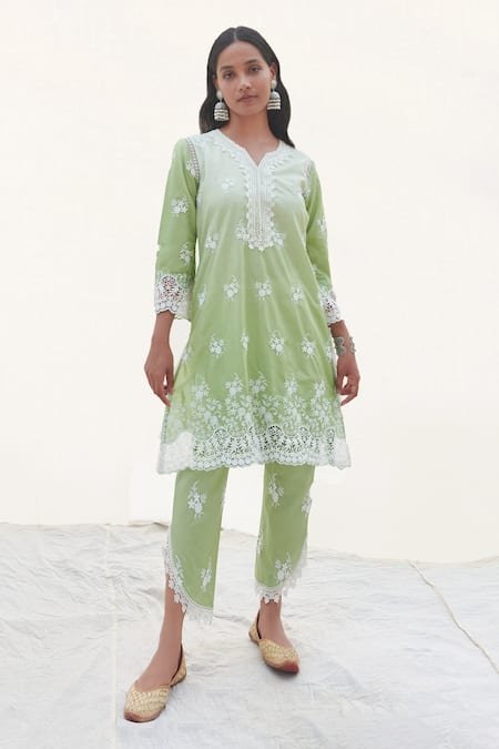 Green 100% Pure Mulmul Embroidered Chapoli Ombre Kurta Pant Set