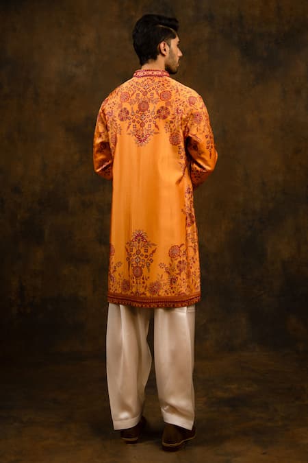 Saffron orange kurta featuring full sleeves with a band collar and all-over bahar digital print