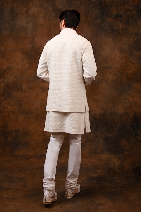 Ivory kurta featuring full sleeves and chikankari embroidery. Paired with a sleeveless embroidered bundi with attached lining.