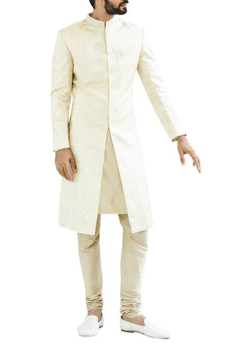 This silk sherwani features a Mandarin collar and subtle gold tone which makes it a versatile choice for any occasion.