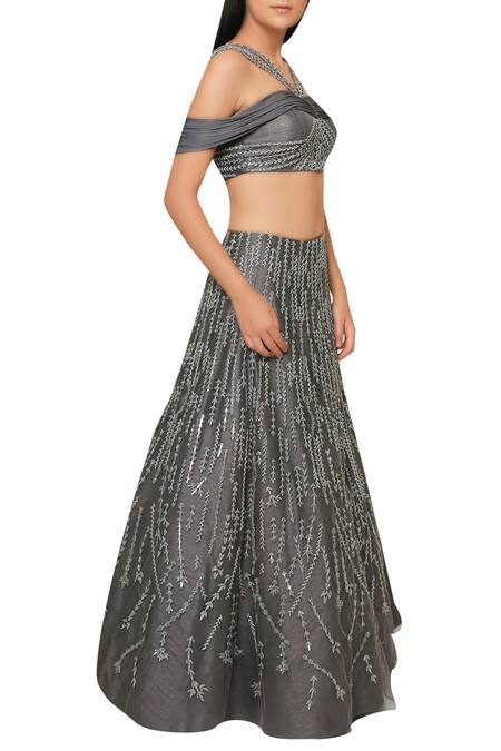 Buy_Reeti Arneja_Charcoal Grey Handcrafted Lehenga With Off-shoulder Blouse_at_Aza_Fashions