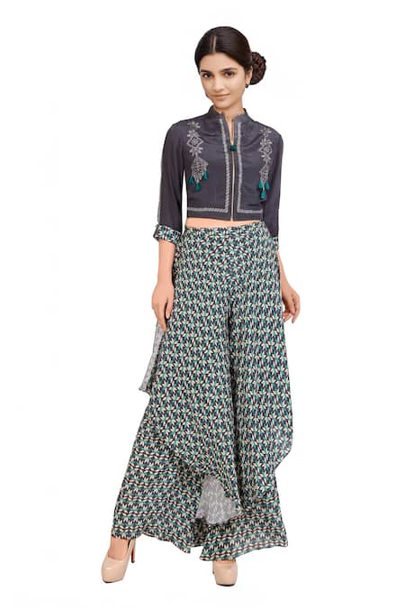 A charcoal grey jacket with zipper detailing and tassels is teamed up with flowy double layered flared pants in a floral print.