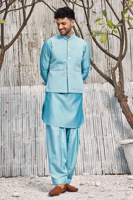 Tropical blue dobby cotton bundi jacket featuring beaded hand embroidery on the right shoulder and left pocket