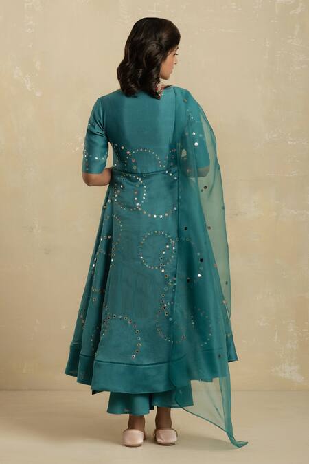 Turquoise anarkali highlighted with multicolored mirror-foil embroidery, round neckline, elbow sleeves & asymmetric hem. Comes with palazzo & organza dupatta.