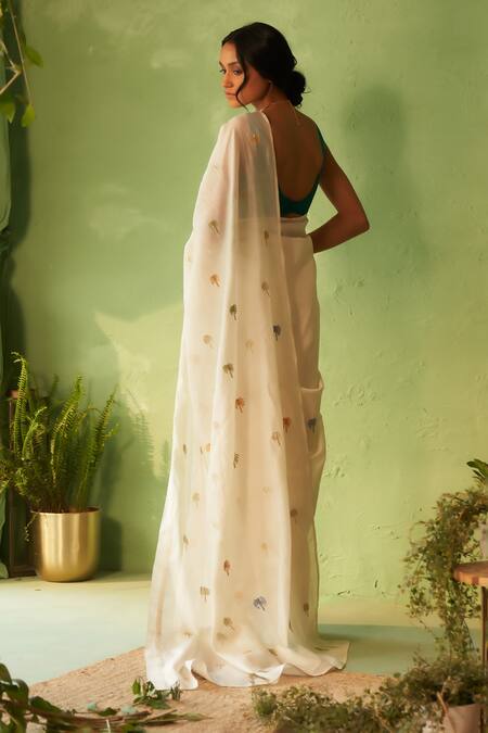 White saree featuring peacock green blouse with machine and hand embroidery. The saree is made of chanderi fabric, while the blouse combines chanderi and voil materials.