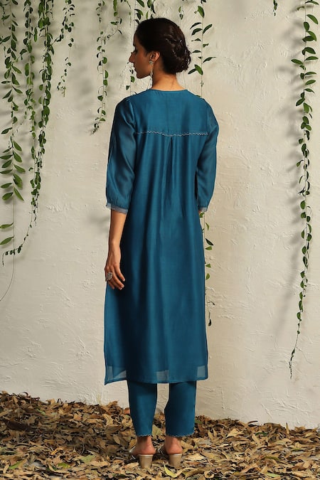 Blue Chanderi, Satin, Embroidery Split Kurta Pant Set With Dupatta