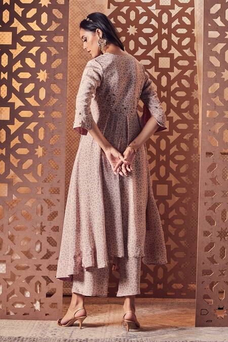 Fawn anarkali with geometric printed motifs, gems & studs embroidery. Paired with printed pant & printed dupatta.