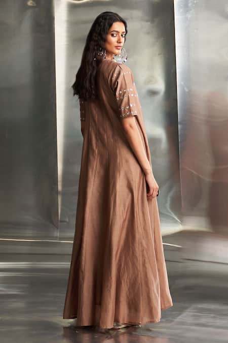 Brown Chanderi, Satin, Mirrors V-neck Embroidered Angarkha Set