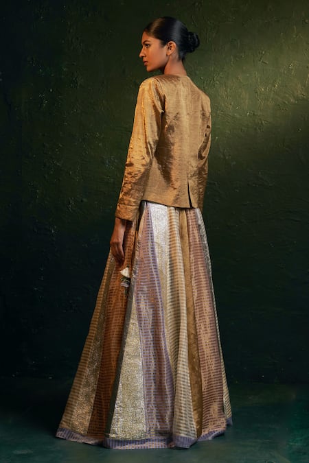 Multi color lehenga featuring a woven stripe pattern and handcrafted tassels. Paired with a metallic full sleeve blazer and deep V neck gota blouse.