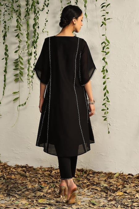 Black kurta featuring scallop hand embroidery and scalloped sheer panelled sleeves. Paired with scalloped edge pant and embroidered dupatta.