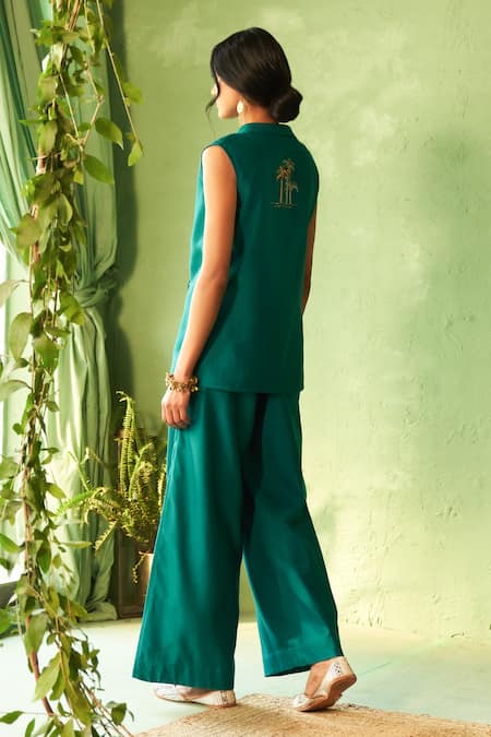 Peacock green jacket featuring machine and hand embroidery with a wrap design. Paired with matching wide-leg pants in chanderi and voil fabric.
