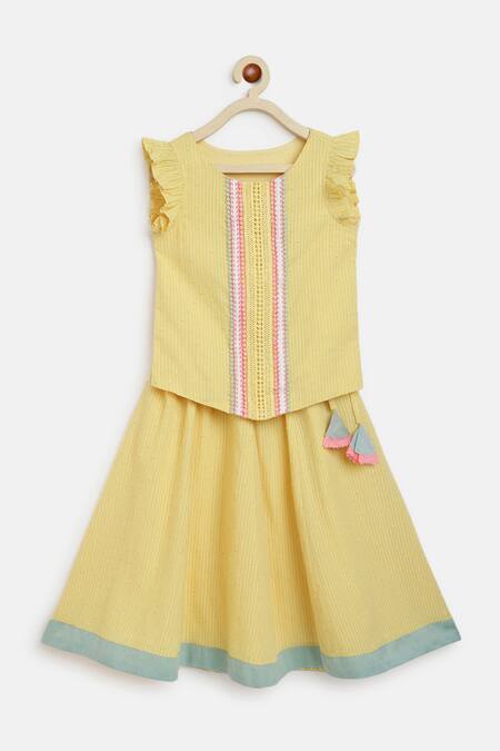 Yellow Cotton Embroidery, Tassels Placement Dori Work Top With Skirt